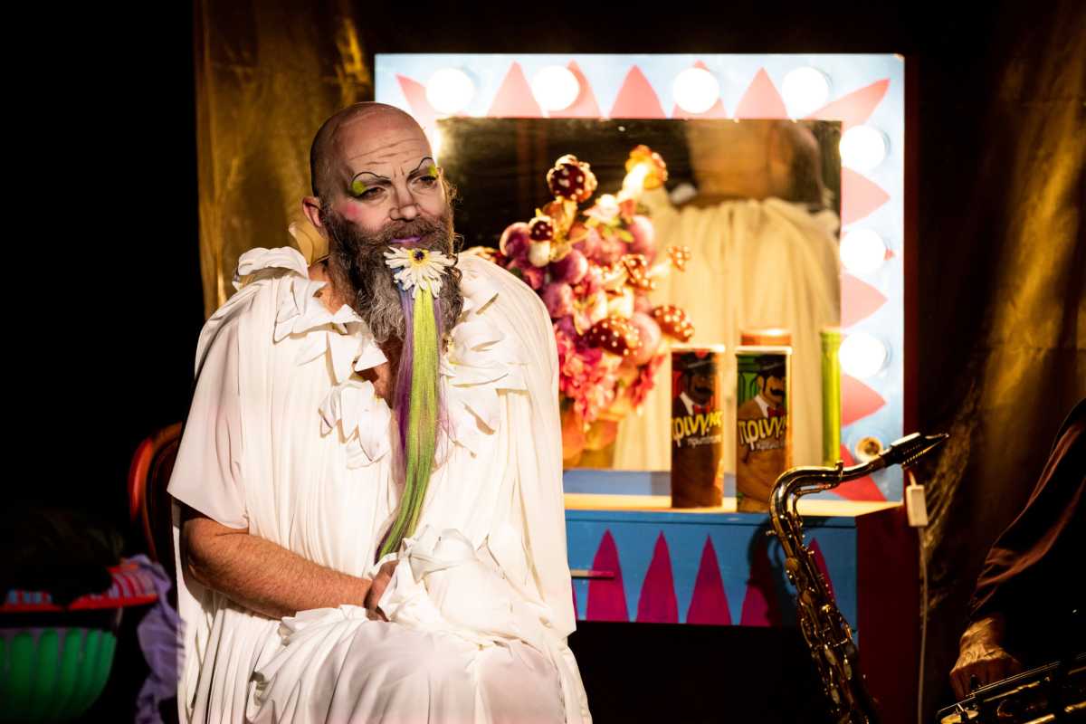At the top of the spectacle, we witness a festive procession of Athenians — acting as a proverbial Greek Chorus — singing a dirge to mourn the imminent demise of the bearded hero, played with a regal-like detachment by Mac. These flamboyant characters evoke genderqueer Radical Faeries, 19th Century British pantomime actors, and New York Club Kids from the early 1990s. The year is 399 B.C., though that’s the precisely to type of historical detail the show takes pains to omit.